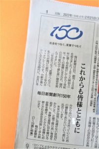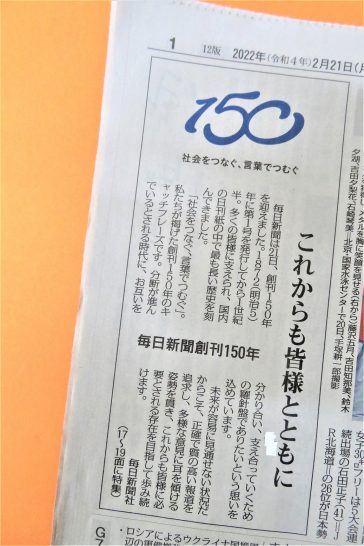 ・本日の毎日新聞に、「毎日新聞は21日、創刊150年を迎えました。1872(明治5)年に第1号を発行してから1世紀半。多くの皆様に支えられ、国内の日刊紙の中で最も長い歴史を刻んできました。(後略)」という記事あり(写真2)。