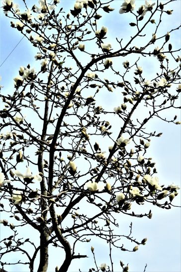 ・総合公園のハクモクレンも咲き出した。先日も少し書いたように、ハクモクレンの花は北向きに咲くと聞いたので、本日は北側から撮ったのが上の写真。心持ちこちらを向いている花が多いように思われる。常識的に考えると花は南向きに咲くと思われるがなぜだろう? 先ほどネットでチェックしたら下のような記事があったのでコピー&貼り付け。