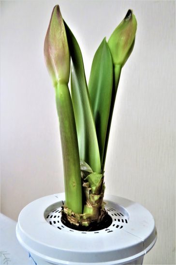 アマリリス、去年は葉っぱが5~6枚ぐいぐい元気よく伸びてから花の茎が出てきたのですが、今年は、写真のように葉っぱは2枚だけで、花茎が2本も出てきました。うまく咲いたら、またアップいたします。