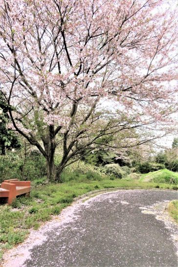 ・本日も暖かで初夏のような日和だったが、夕刻散歩では雲が広がって、車の外気温計は20℃だった。写真1は、夕刻散歩にて、総合公園の「私の桜」とその下の桜色に染まった遊歩道。これが今シーズンのピークだろう。