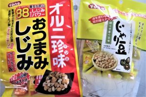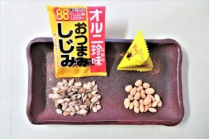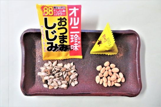 ・晩酌の肴は家内の手料理で充分なのだが、若い頃から「かわきもの」が好きで、「箸休め」とか「口直し」などと言って、今でもポリポリ食べている。以前はピーナッツの入った煎餅が好きでよく買っていたが、少しボリュームが過ぎるようになったので、最近、欠かさぬように買っているのが写真2の「じゃり豆」と「おつまみしじみ」。この2つに共通しているのは、1袋の分量が少なくて食べやすいこと(3)。そして、使用している材料に「ひまわりの種子」が入っていること。ひまわりの種子にはオレイン酸がたっぷりと入っているとの宣伝文句。オレイン酸とは?⇒ オレイン酸 | 成分情報 | わかさの秘密