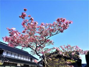 ・本日、朝8時から保地区の春の総事(そうごと)。総事というのは各戸から1人出席する義務(高齢者世帯は申請すれば免除される)のある溝掃除とか草取り。我が2班でいちばん厄介だった大きな側溝は、先年「通学路だから」と、グレーティング工事が完了。溝掃除から解放されてラクチン。もっぱら路側帯の草取りと泥除去。9時前頃にダンプが来たので雑草や泥土を積み込んで、後は大元神社(写真1)の境内の掃除。この鳥居の後ろには「皇紀二千六百年記念」「昭和十五年建立」と書いてある。2は、公民館近くのお宅に見事に咲いていたピンクのハナミズキ。3は、公民館玄関前の寄せ植え。