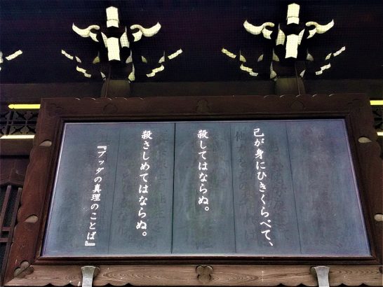 ・下の写真は昨日(11日)、東本願寺に立ち寄ったときに見た大きな掲示板。佛陀の言葉として【 己が身にひきくらべて、殺してはならぬ。殺さしめてはならぬ。】と書いてあった。これを見てすぐに「プーチンに見せたい」と思った。もちろん、これは単に「人の命を奪うなかれ」だけではなく、「異論を封じるな」「少数派を黙殺するな」というような広い意味もあるのだろう。この掲示板、大きいのだが、目立たない軒下で通路からも離れているので、みんな素通りしてほとんど見ていなかった。 〔仕事と歩数〕岩美向け作句&出席。2,103歩(出張中に歩き過ぎたので本日は休息)。