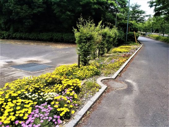 ・本日、午前中は曇天だったが、夕刻散歩のときはポツポツ降りかかっていた。写真は昼前散歩にて、総合公園エントランス沿いの花壇。鮮やかな黄色はガザニア。 〔仕事と歩数〕仙台文学館「ことばの祭典」選考。5,160歩。
