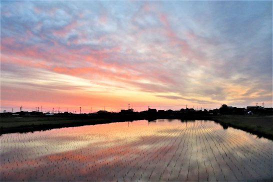 ・写真1、水田に映った鮮やかな朝焼け(お寺に向かう途中。4時53分頃)。2、寺からの帰路。上郷谷を振り返って。水田はほとんど田植完了の模様。〔仕事と歩数〕月初めの各句会向け作句。5,342歩。