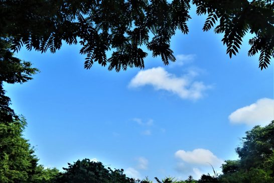 ・本日も快晴。最高気温は25℃程度で湿度も少なく過ごしやすかった。写真は昼前散歩にて。木の間から覗いた青空と浮雲。〔仕事と歩数〕仙台文学館「ことばの祭典」選評完了後メール送稿。5,477歩。