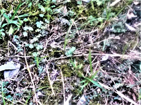 ・写真2、今日の昼前散歩にて。総合公園の和風庭園?を歩いていたら、青蛙🐸の子どもが驚いたようにピョンピョン。スマホを向けるとまたピョンピョン。ようやく止まったところをパチリ。左横のクローバーの葉より少し大きいぐらい? ・ 〔仕事と歩数〕大山滝句座会報作製。5,777歩。