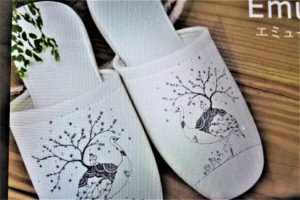 ・写真1は、昨年に頂戴した絵葉書のイラスト。ちょっと変わっていて面白いので、イラストだけを拡大コピーしたもの。2は、その隅っこに小さく書いてあったサイン。拡大したが読めないので誰の作かは不明(ご存知の方は教えてください)。見たことがある絵なので、どこかにヒントがあるハズと、ネットにて「イラスト絵葉書」で検索してみたら【かめいち堂】というところのポストカード20枚の中の1枚が写真3だった。左下のサインは2と全く同じだが、イラストは少し違っている。梯子と小さな小屋がある1の方が面白いと思うが、まあ好き好きだろう。また、同じサイトで「かめいち堂」の商品がたくさん載っているが、その内の1つがスリッパ(写真4)。こうして見ていると、かなり有名なブランドのようで、私だけが知らなかったのかも…(-_-;)。