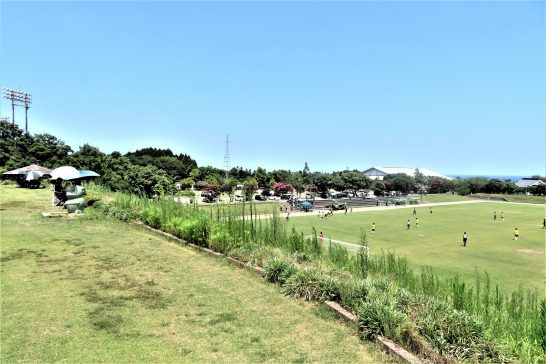 ・写真、本日の昼前散歩にて。総合公園サッカー場上の広場。サッカーの応援で少しでも高い所の方が涼しいと思われたのか、5~6人がパラソルを立てて、折りたたみ椅子で観覧していた。〔仕事と歩数〕しんぶん赤旗「読者の文芸」再チェック後メール送稿。某企業川柳コンテスト選。5,683歩。