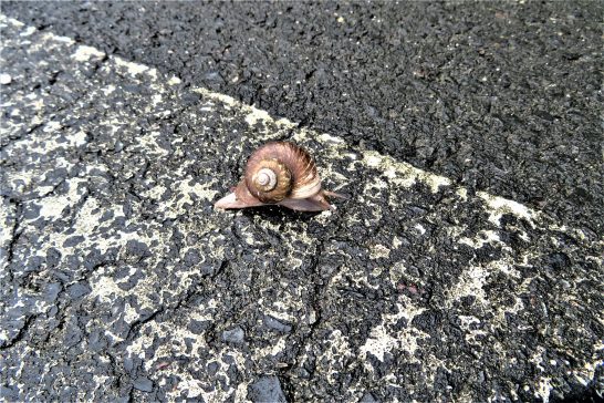 ・本日、明け方前からカミナリがゴロゴロ。2回ほど直近でドカンドカンと音がしてすっかり目が覚めてしまった。写真1、昼前散歩で、雨の上がった農道を歩いていたら、花びらがいっぱい落ちていた。見上げると葛の花が満開だった(写真2)。3、カタツムリが車道に向かってのんびり這っていたので草むらへ戻してやった。〔仕事と歩数〕毎日新聞山陰柳壇選考。9月の句会や大会に向けて作句。5,034歩。