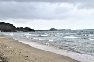 ・写真1、曇天の浦富海岸イーストサイド。2、ウエストサイド。 波が荒くて、♪・今はもう秋~ 誰もいない海~~ トワ・エ・モアの歌のムードではなかった。 〔仕事と歩数〕岩美川柳会向け作句&出席。6,117歩。