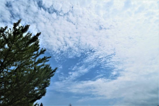写真は、昼前散歩での面白い雲の模様。〔仕事と歩数〕センマガ懸賞川柳「文月賞」選考。山陽カルチャー資料作成。 6,362歩。