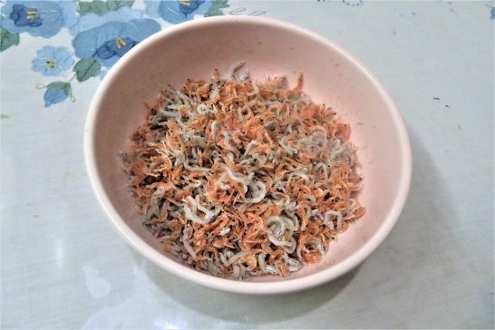 何だか健康に良さそう。皆さんもマーケットで見つけたらゲットしてください。メチャ安の割にはお好み焼に混ぜたり、卵焼きに入れたり用途はいろいろです。写真、ジャコとイサダを混ぜたもの。、ジャコとイサダの大きさ比べ。