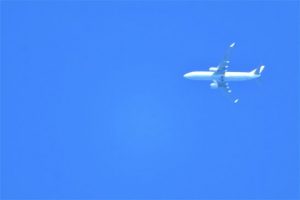 ここ数日と打って変わって、本日は爽やかな秋晴れ。昼前散歩で農道を歩いていたら、1羽の鳶がいかにも「見てくれ!」と言わんばかりに、悠々と大きな輪を何度も描いていた(写真)。その直後に西行きの旅客機がゴーと現れたのでパチリ()。鳶は静かに舞っていたが、飛行機は煩かった。それを見て【 空を飛ぶ夢が戦闘機になった 】という竹信照彦さんの句を思い出した。この句は、センマガに連載している「名句を味わう理論と鑑賞」№49(2015年8月号)で取り上げている。その前半だけご紹介。