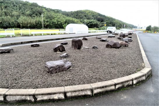 ・写真6、普通は草花や街路樹が植えられている道路の横の、いわゆる「植樹帯」だが、このコスモス迷路の近くのは、写真のように砂利と石で、まるで竜安寺の石庭のようなムード。これはこれでスッキリして雑草を取る手間も要らなくて良いだろう。が、毎日観ていると飽きるのではないか。やはり季節の移ろいが感じられる草花が良いのではないか。まあ、余計なお世話だが…(-_-;)。