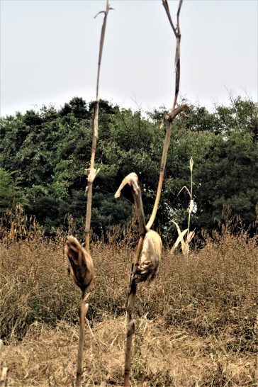 ・写真は、飼料用トウモロコシで、刈り取り機から外れて残ってしまったもの。名付けるならば「枯れ野のオブジェ」。〔仕事と歩数〕大山滝句座会報インプット。6,724歩。
