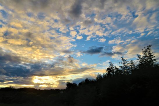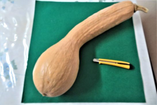 ・写真上、本日午後5時前の夕映え。「明日は快晴ですよ」と言っていた。写真下、(昨日アップしていたが今日に移設)昨日、友人が「3個貰ったので1個おすそ分け」と持って来てくれたもの。瓢箪か?と思ったらカボチャとのこと。大きさ比べでカッターナイフを置いてみたが、緑色のフエルトの1辺は40センチ。カボチャの実寸は尻から茎の先まで45センチだった。「もちろん食える!」と言っていたが、どうも食欲が湧く姿形ではない。〔仕事と歩数〕愛染帖選考後PCインプット。7,090歩。