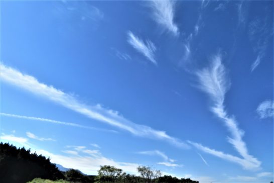 ・写真1、昼前散歩での面白い雲。飛行機雲が崩れたのか?とも思うが、それにしては高度が低かった(風で下がってきたのか?)。2、午後4時半ごろ、夕刻散歩に出たら、すぐ頭の上に気持ちが悪いほどの鱗雲。