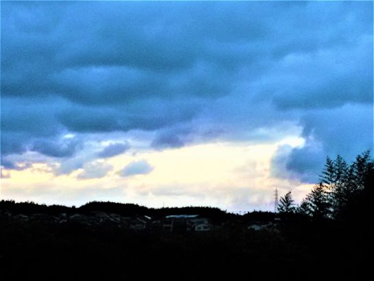 ・夕刻になってようやく雨が止んだので散歩に。厚い雲の西北辺りが少し切れて夕映えが覗いていた(写真)。〔仕事と歩数〕センマガ名句鑑賞。葬儀受け付け。5,416歩。