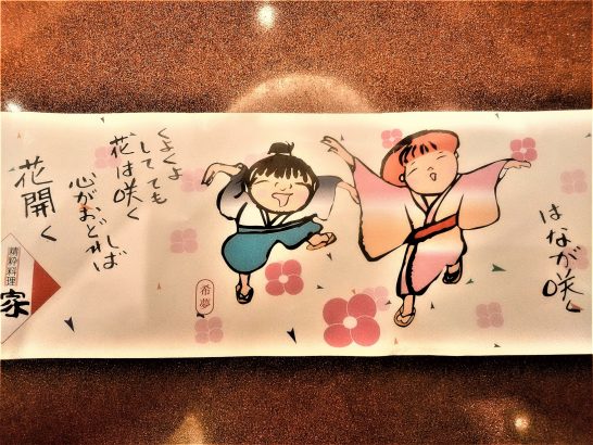 ・写真は10日の大会にて、昼食に頂戴したバラ寿司の箱に巻いてあった紙の帯。バラ寿司を美味しく頂きながら楽しい絵を見て、横に書いてある「くよくよしてても花は咲く 心がおどれば花開く」を読んで、「くよくよしても花は咲く 心おどれば花開く」にしたらリズムの良い七五調になるのにと思った。