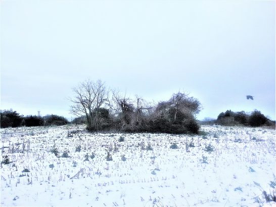 ・本日、朝から曇天。写真は農道横の原っぱの雪の状況。右端の中ほどに飛んでいるのはカラス。「ガァーガァー!」と威嚇するように鳴いて頭上を飛んで行った。昼前散歩は2,800歩程だが夕刻散歩では冷たい雨が降ってきたのでホームセンター内をうろうろ。〔仕事と歩数〕塔社向け「愛染帖」「飛行船」などチェック後メール&郵送。4,668歩。
