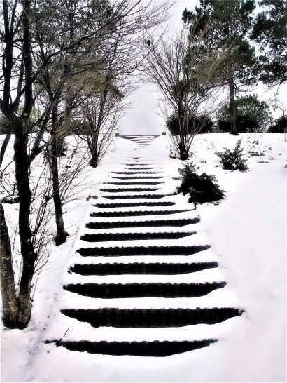 ・こちら鳥取、今回の寒波はどうやら過ぎた模様で、向こう1週間の長期予報では、雪だるま⛄模様は出ていない。本日も昼間は曇天でときどき小雨だったが、夕刻散歩では久しぶりに青空が広がっていた(写2)。1は、昼前散歩にて。総合公園内の石段の雪模様。3は、夕刻散歩にて。土曜日というのに犬の子も猫の子も人間の子もいなかった。外気温3℃では当然のことだろう。