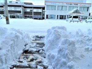 ・昨夜から今朝にかけて、路面で20~30センチの降雪。朝一番の仕事は除雪車が掻き上げた店先の雪の塊を除去すること。降り積もっただけの雪は柔らかいが、除雪車が掻いたのは固まって重たい。取り敢えず人間が通れる幅だけ除去してご勘弁願う(写真2)。