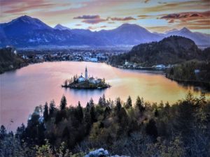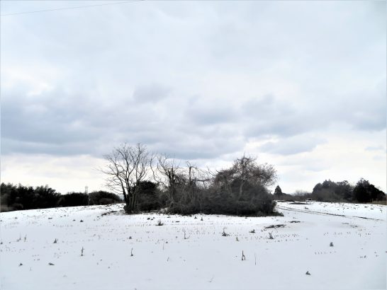 写真、本日の昼前散歩にて。野原の残雪状況。空は典型的な山陰の冬模様。、昨日からのPC待ち受け画面。スロベニアのブレッド湖とのこと。〔仕事と歩数〕倉吉句会&鹿野句会等向け作句。5,539歩。