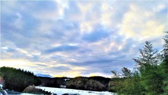 写真、夕刻散歩にて午後5時頃の西空。、総合公園の遊歩道。短靴では無理なので、Uターンして外周道路を歩く。〔仕事と歩数〕センマガ「名句鑑賞」。5,973歩。