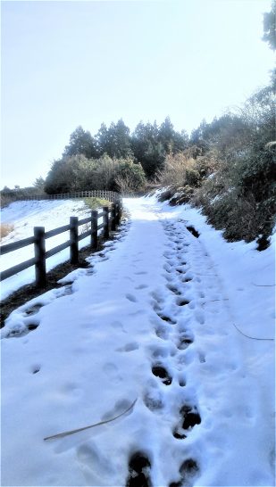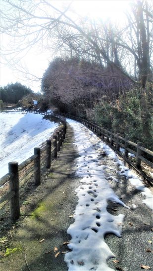 写真、昼前散歩の総合公園にて。遊歩道の雪も溶け出して何とか歩けるようになった。、ところが坂を上るにつれて溶けているところが狭くなって短靴ではやっとこさ。〔仕事と歩数〕しんぶん赤旗「読者の文芸」選考ほか。5,274歩。