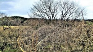 写真、夕刻散歩にて。昨夕と反対に北の空から晴れてきた。、茶色の蔓がいっぱい絡まった冬枯れの風景。〔仕事と歩数〕大山滝句座会報作成。6,086歩。