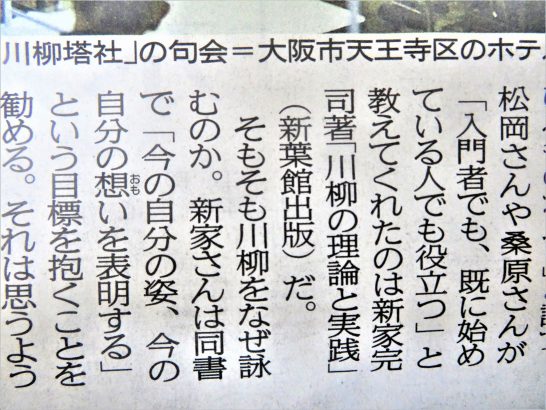 ・本日、朝一番に、「日本海新聞に川柳塔社の句会と、新家完司さんのお名前と『川柳の理論と実践』などが載っています」と川柳の仲間からショートメールを頂戴した。確認してみると、7面に大きく上の写真2。この記事が最初?に出たのは山梨日日新聞だったと思う。山梨の川柳仲間がブログの記事でアップしてくださった。先日も出雲の友人から「山陰中央新報に載っていますよ」とファックスで送ってくださった。川柳塔社編集長の桒原道夫さんによると「もう10社ほどに掲載されています」とのこと。この記事によって少しでも川柳を志す人が増えたら嬉しいのだが…。写真3は、私の著書について書かれている部分のクローズアップ。