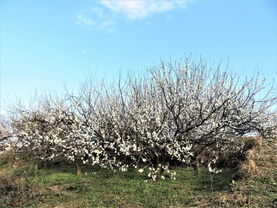 ・本日、最高気温13℃。いよいよ待ち兼ねた春到来! 夕刻散歩の総合公園外周農道にて、いい香りに誘われて梅林をパチリ(写真1)。〔仕事と歩数〕毎日新聞山陰柳壇向け選考ほか。5,782歩。