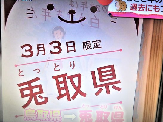 ・本日、3月3日は雛祭りだが、【うさぎの日】でもある。兎年のウサギの日ということで、鳥取県では本日を【兎取県】として、職員が兎の耳の被り物を付けて仕事に励んでいた。(写真2、3)