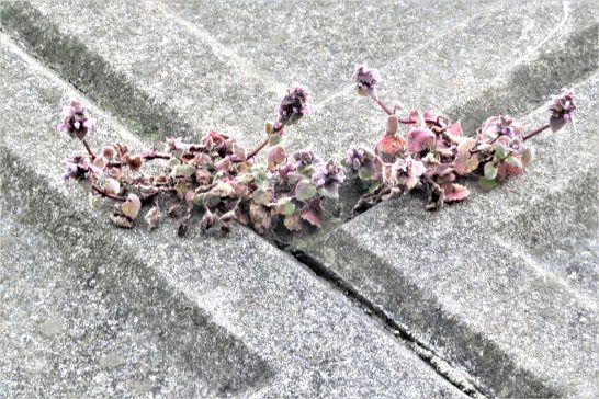 ・写真1、2、擁壁ブロックの隙間で咲いていたヒメオドリコソウ。そして、芽吹きだした蔓。〔仕事と歩数〕しんぶん赤旗「読者の文芸」選考&インプットほか。5,261歩。