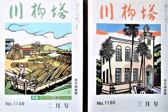 ・写真1、案内ハガキの絵。大芋棚田の春(和歌山)。写真2、塔誌2月号(ヨシの収穫・近江八幡)と、3月号の表紙(ヴォーリズ・旧水口図書館)。