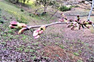 ・昨日、鳥取市で「開花宣言」したということで、朝刊にも写真が載っていた。で、総合公園の桜を見て回ったが、花芽は膨らんで、全体が薄いピンク色に染まってきているが、まだ1輪も咲いていなかった(写真1)。その中で「明日開きますよ~」と言っている枝があった(写真2)。〔仕事と歩数〕愛染帖選考PCインプット。6,175歩。