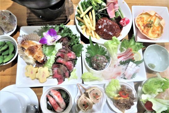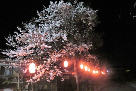【午後9時50分追記】6時30分から宴会開始。参加者5名。会費4,000円で飲み放題。料理は写真上のように盛り沢山。これにデザートがつく。私が平らげたのは左下の「茶碗蒸し」と右上の蟹の甲羅に入ったグラタン。そして刺身盛り合わせと左上の蟹鍋。他は半分以上も残してしまったが、「持ち帰り用パッケージ」に詰めて貰って持ち帰り。芋焼酎の湯割りは4杯?ぐらい。運転代行で帰る4人とバイバイした後、近くの徳万公民館の夜桜を撮ってから帰宅。この提灯、奥の方まで100メートル近く飾られて風情があるのだが、犬も猫も人間もいなかった。(写真下)