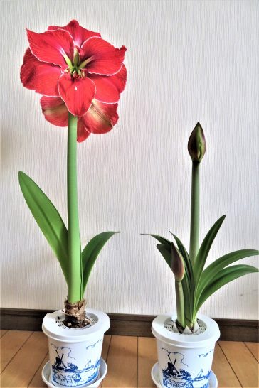 ・写真のアマリリス。いずれも宅配便のスタッフが斡旋していたのを購入したもの。左側のは3年前に購入。今年で3回目の花を楽しませて貰っている。花の大きさは直径20センチほど。右のは今年の春先に購入したもの。午前中に陽の当たる同じ場所に置いているのだが、右のはゆっくり伸びてきて、ようやく花芽が2つ顔を出している。