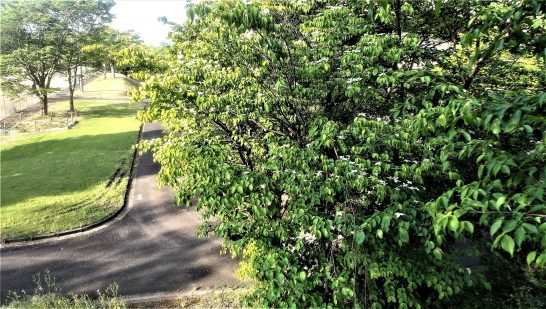 ・写真、総合公園テニスコート横のヤマボウシ。〔仕事と歩数〕愛染帖PCインプット。大山滝句座段取り。7,009歩。