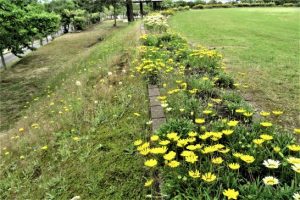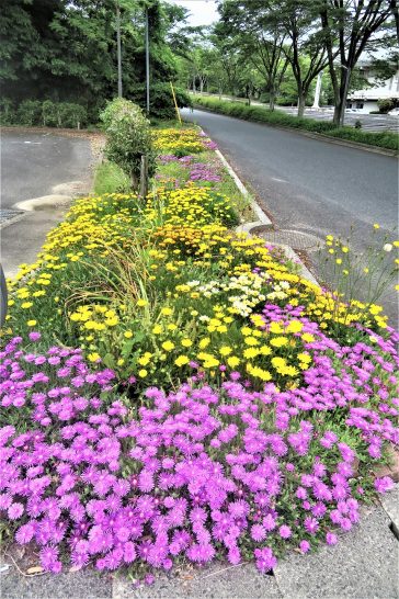 ・写真1は総合公園入口の花壇。2はサッカー場上の花壇。〔仕事と歩数〕大山滝句座会報発送段取り&発送。5,858歩。