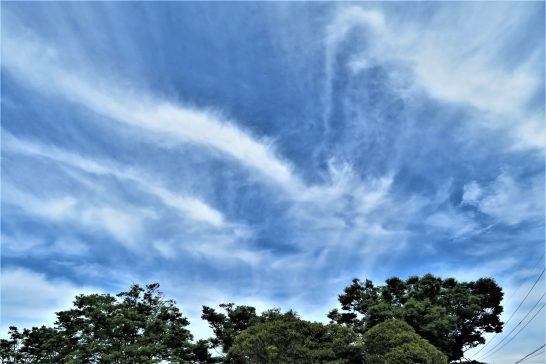 ・本日、夕刻散歩ではポツポツ降ってきたが、昼前散歩のときは快晴で、写真1はダイナミックな雲。〔仕事と歩数〕。きぬうら川柳大会「投句の部」選考。7,074歩。