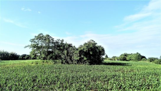 ・本日、朝からずっと雨だったが、気象庁の「雨雲レーダー」を確認すると、夕刻から雲が切れてゆく映像だったので、午後4時30分に夕刻散歩に出たら、予報通り綺麗な青空が見えてきた(写真1)。植え込みはグングン伸びている飼料用トウモロコシ。