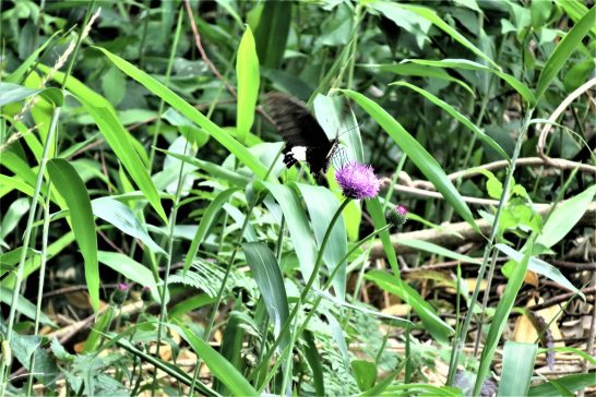 私の見立てでは、これはモンキアゲハの♂一頭が、アザミの吸蜜をしているところではないかと思います。