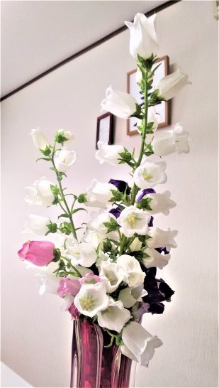 ・写真1と2は昼前散歩の農道にて。アザミの蜜を吸っている蝶。図鑑で調べるとモンキチョウ(全体が黒色で後翅中央に大きな白斑がある)らしい。3はご近所の奥さんがたくさんくださったホタルブクロ?〔仕事と歩数〕山陽カルチャー資料作成。7,636歩。