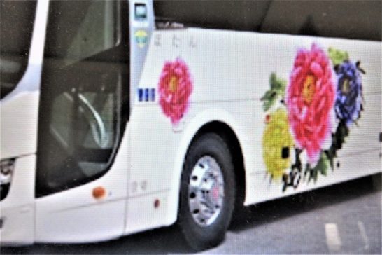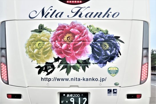 ・写真1、たまに見かける大きな牡丹が描かれているバス。昨日、岩美へ行く途中の9号線でずっと私の前を走っていたので信号待ちのときにパチリ。帰宅してネットで調べると島根県の仁田観光株式会社のバスで、ホームページには私が撮れなかったバスの横のが載っていた(写真2)。島根では大根島の牡丹が有名だが、その関連だろうか。 〔仕事と歩数〕川柳塔社連絡事務様々。6,628歩。