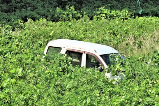 ・写真1、夏草に埋もれ嘆いている廃車(ゴルフ練習場跡にて)。2、野イチゴをちょいと摘まんで散歩道(きょうは2粒頂戴した)〔仕事と歩数〕愛染帖選考。5,850歩。
