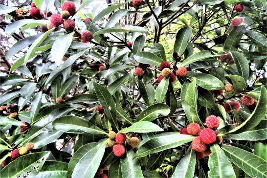 写真、昼前散歩の総合公園サッカーグランド横のヤマモモ。雨に打たれていっぱい落果していた。、会場すぐ横の一級河川小鴨川」の清流。帰宅してから少しだけ散歩。細かい雨だったので傘を差すほどではなかった。〔仕事と歩数〕倉吉川柳会向け作句&出席。6,212歩。