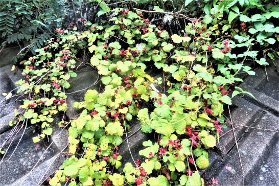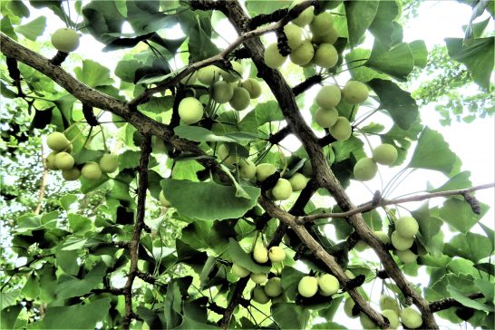 ・写真1、夕刻散歩にて。総合公園駐車場の公孫樹に銀杏がいっぱい成っていた。2、農道では野イチゴもいっぱい。〔仕事と歩数〕鹿野川柳会向け作句&出席。6,022歩。
