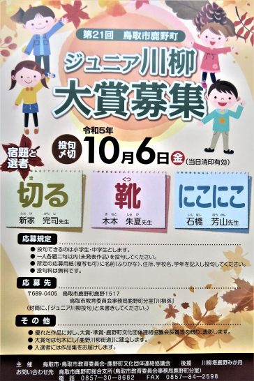 応募先 〒689-0405 鳥取市鹿野町鹿野1517 鳥取市教育委員会事務局鹿野分室「川柳係」(封筒に、「ジュニア川柳投句」と朱書きしてください)